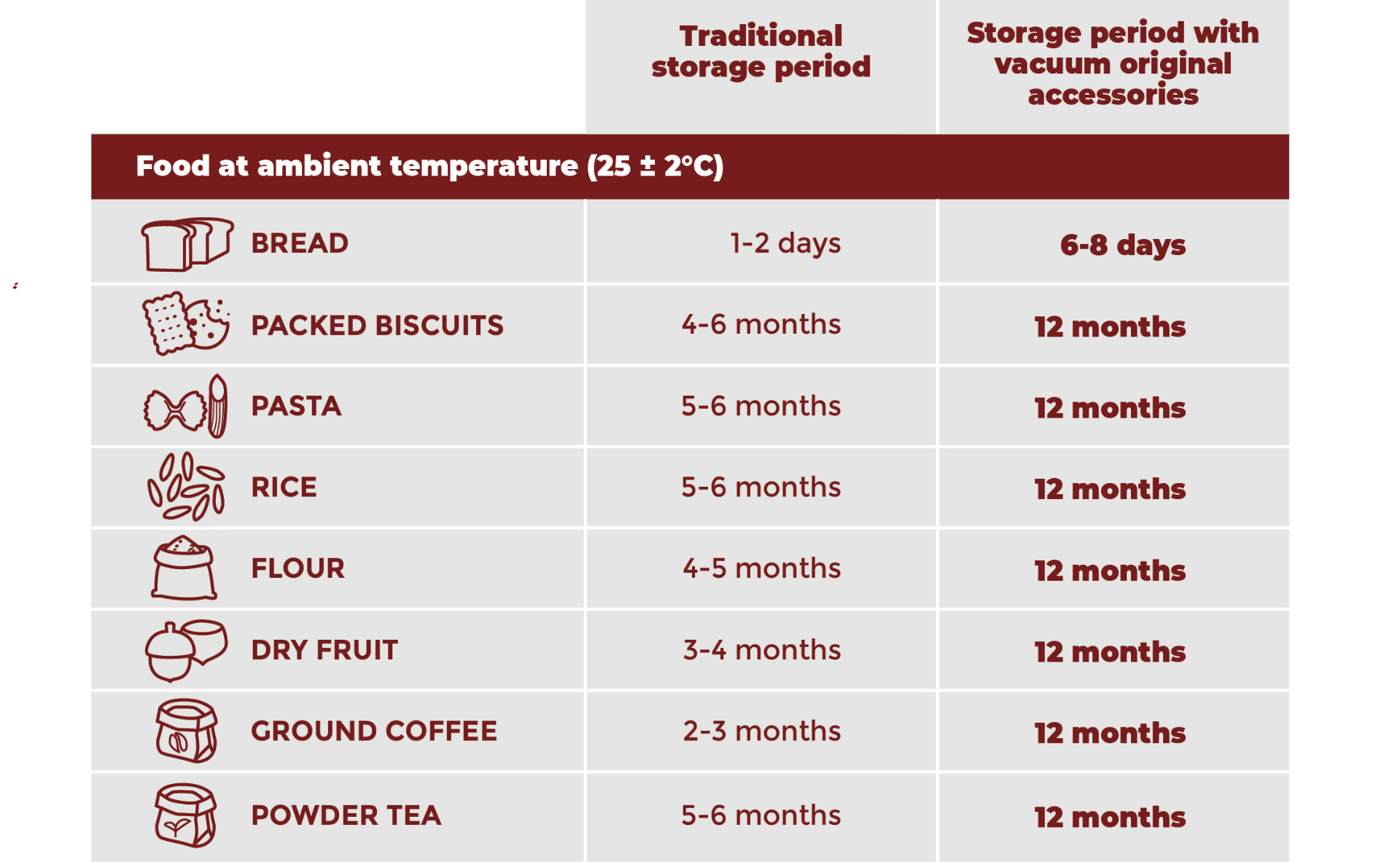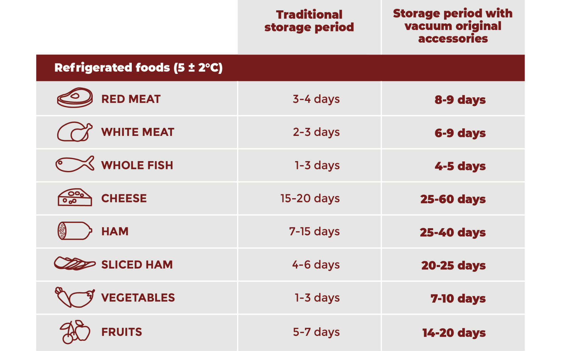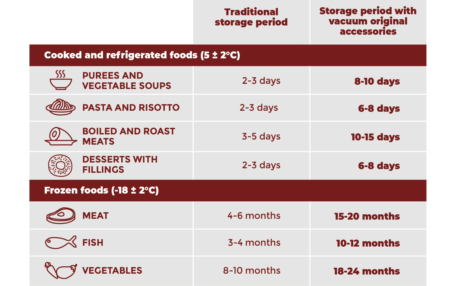 *Indicative values that depend on the integrity of the package and on the quality characteristics of the original food. They also refer to the packaging obtained with the combination of machine – bags/rolls, containers and “original” accessories.
