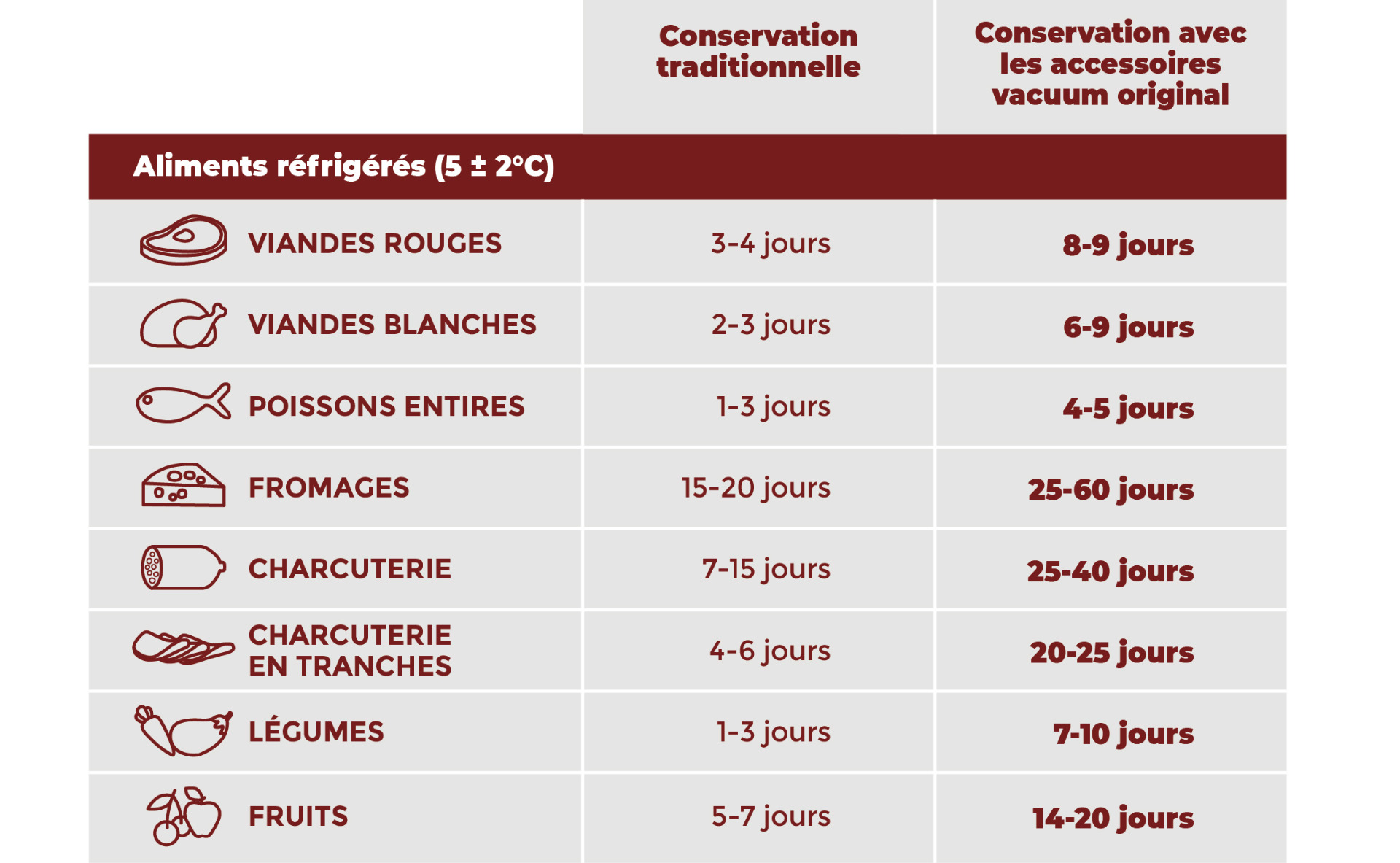 Regardez le tableau de comparaison et découvrez comment change la conservation des aliments plus communs.