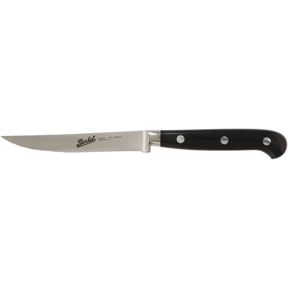 Coltello corto e maneggevole. Grazie alla punta ed all'affilatura consente di tagliare con precisione la carne cotta limitando le rotture. Resiste alla corrosione ed allo sfregamento con la ceramica del piatto, caratteristiche necessarie per l'uso quotidiano.