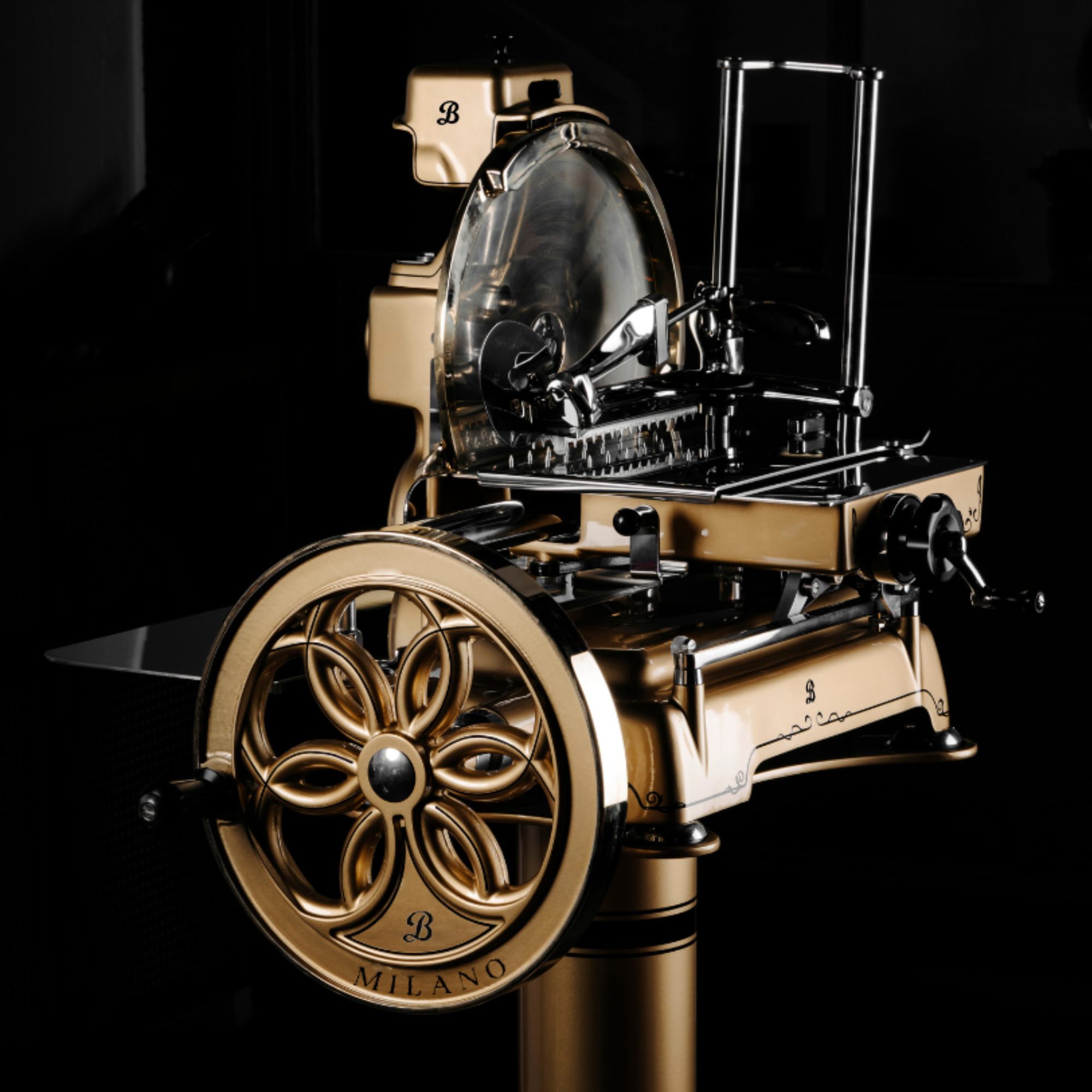 A flywheel slicer for home use with an outstanding cutting capacity and an appearance inspired by models of the past. It ensures a perfect cut and features a vintage design with sophisticated finishes.